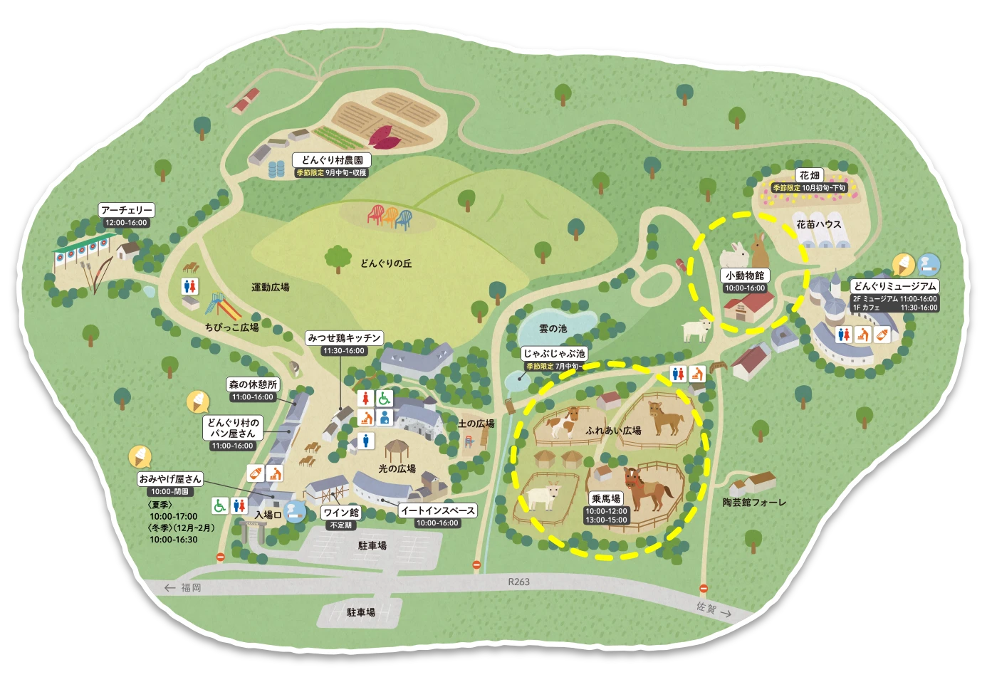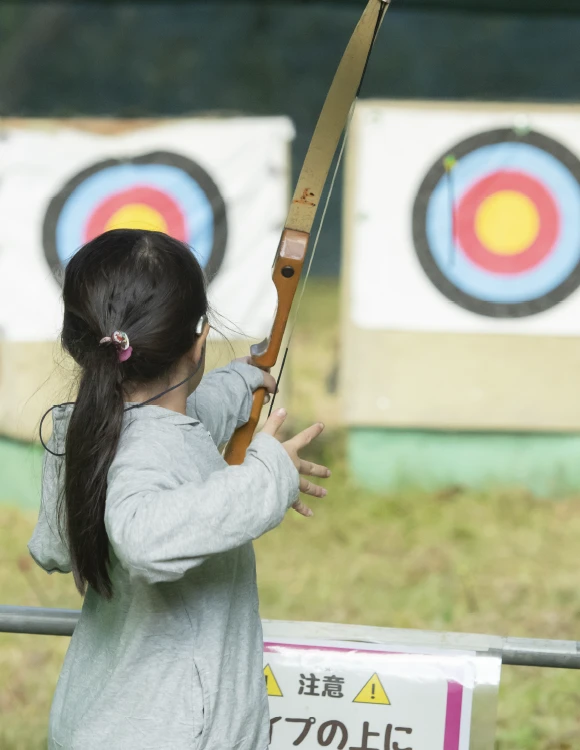 どんぐり村の広々とした⾃然の中で、